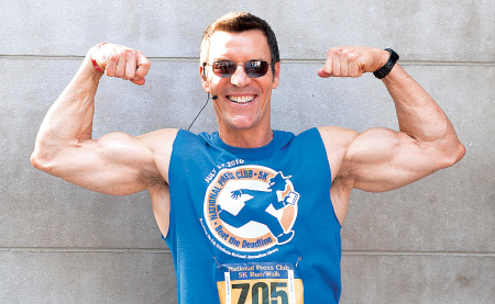 We’re shooting an X2 vid and, in this program, we do most movements out of unstable or athletic position to induce more muscles to fire. During one set of a biceps movement Tony drops into a stable platform and picks up more weight. “Sometimes,” he says. “Maybe all you care about are your guns.”